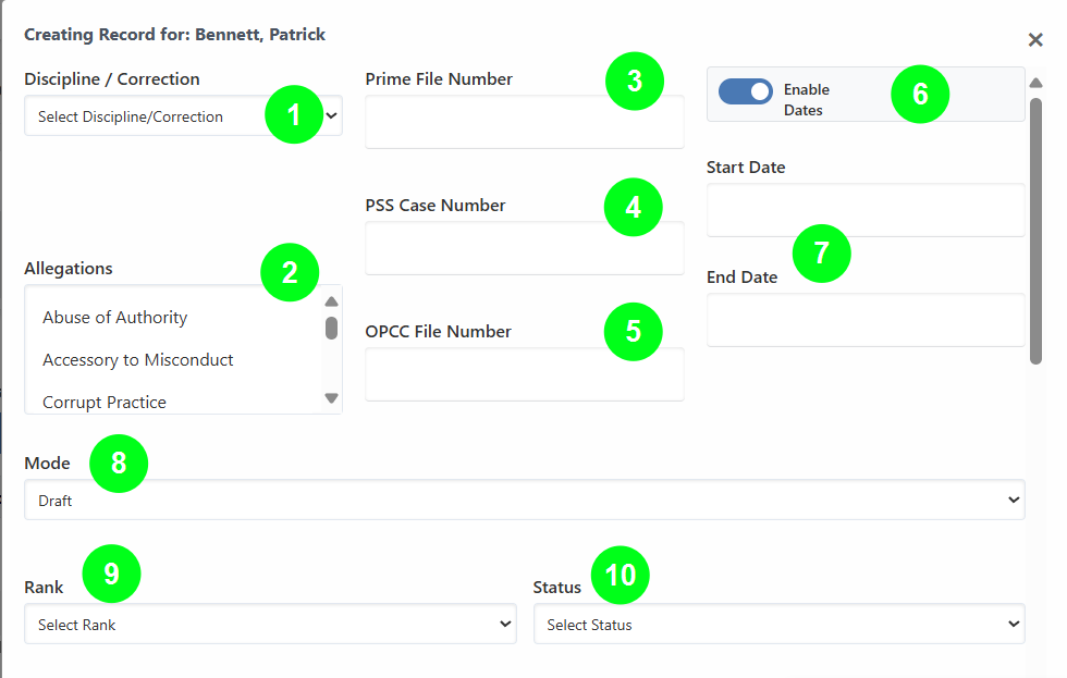- Discipline/Correction - Action taken on this record. This drop-down can be customized to the Police Act in your jurisdiction