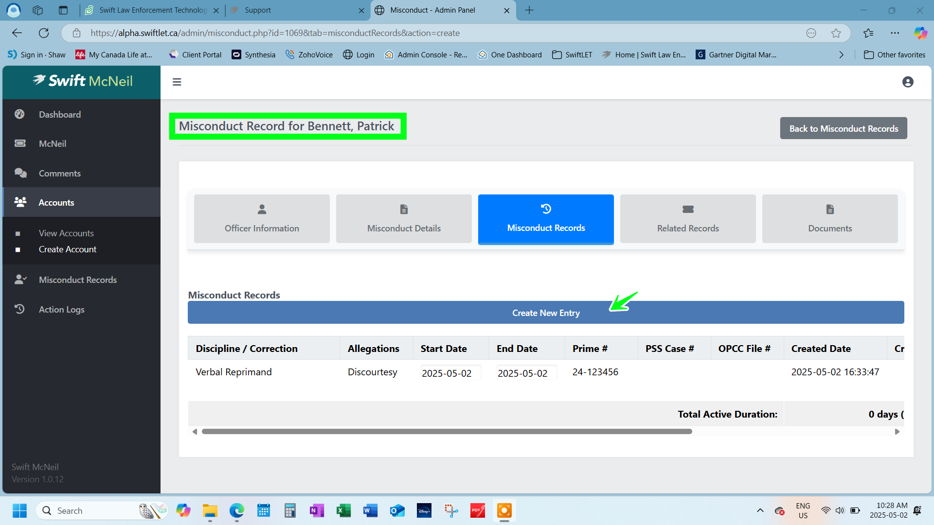 In this case, to add a new Service Record of Discipline click the large Create New Entry button. Note on this example Sgt. Bennett already has another active SROD which is displayed.