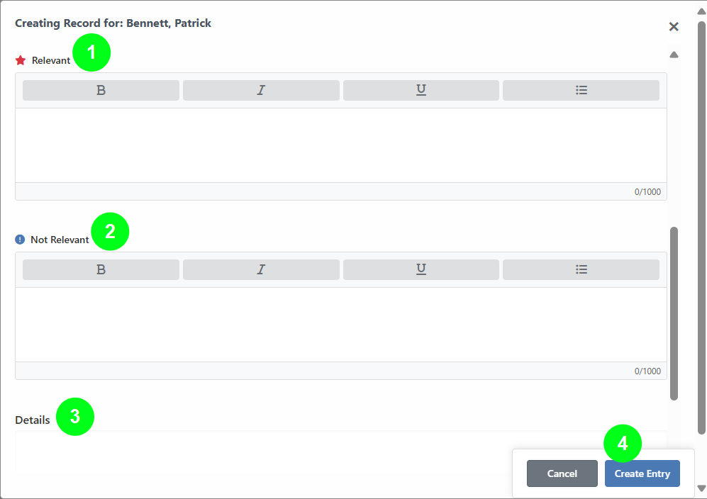 - Dates Toggle - by default dates are required, but if unknown, this toggle will allow the record to be saved without dates