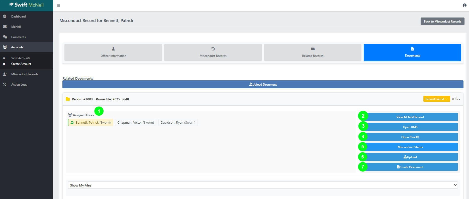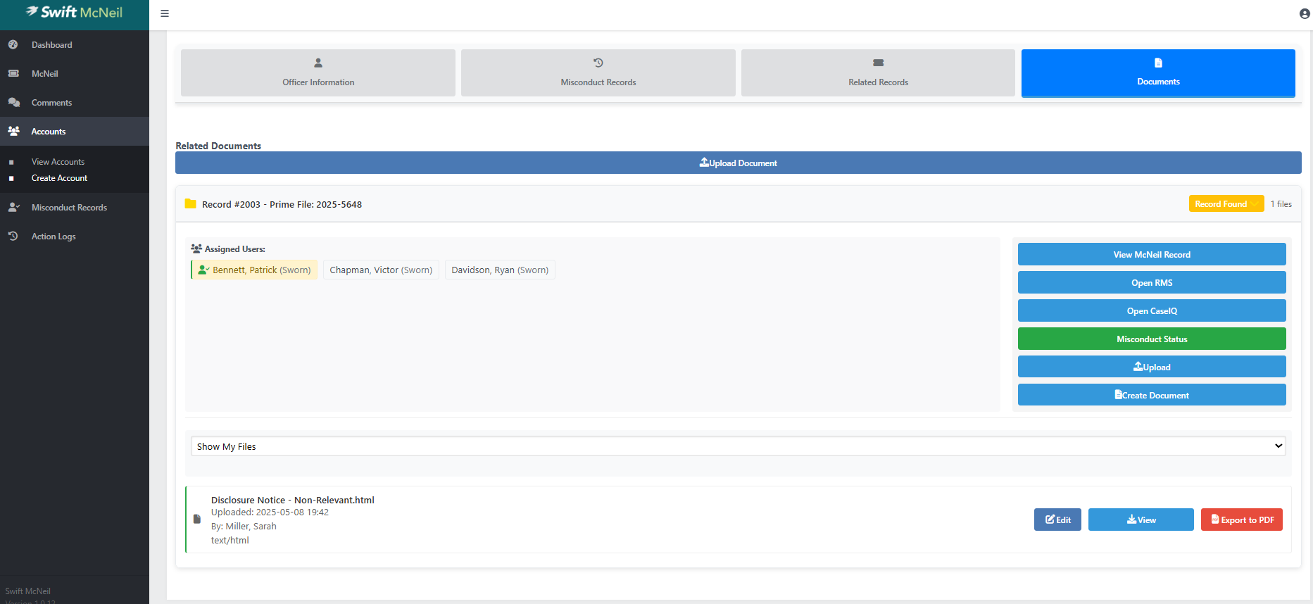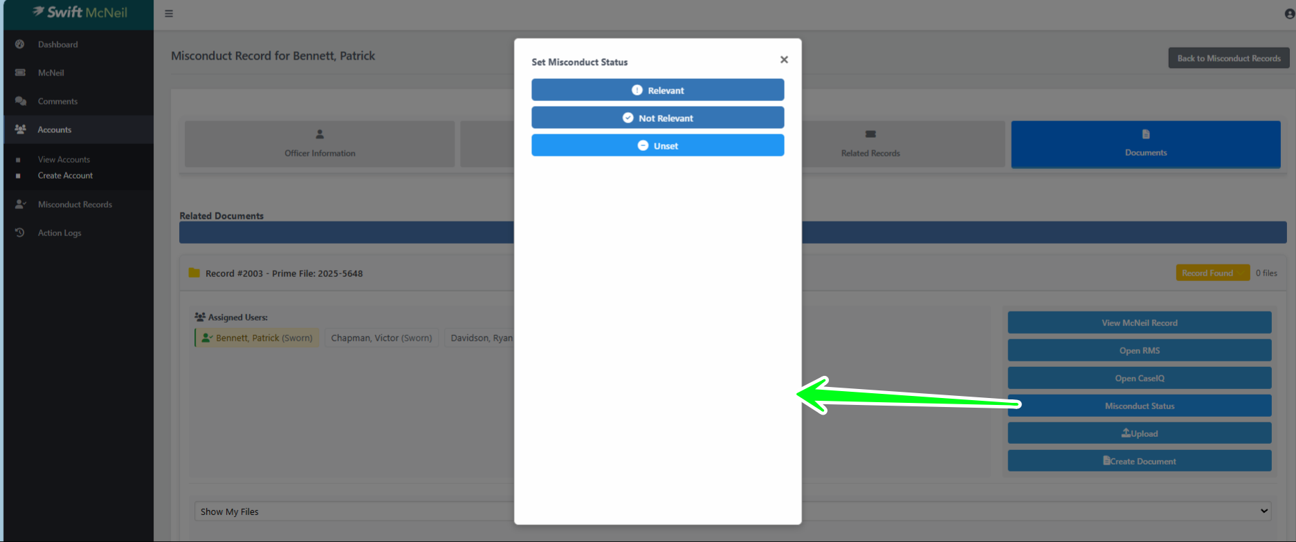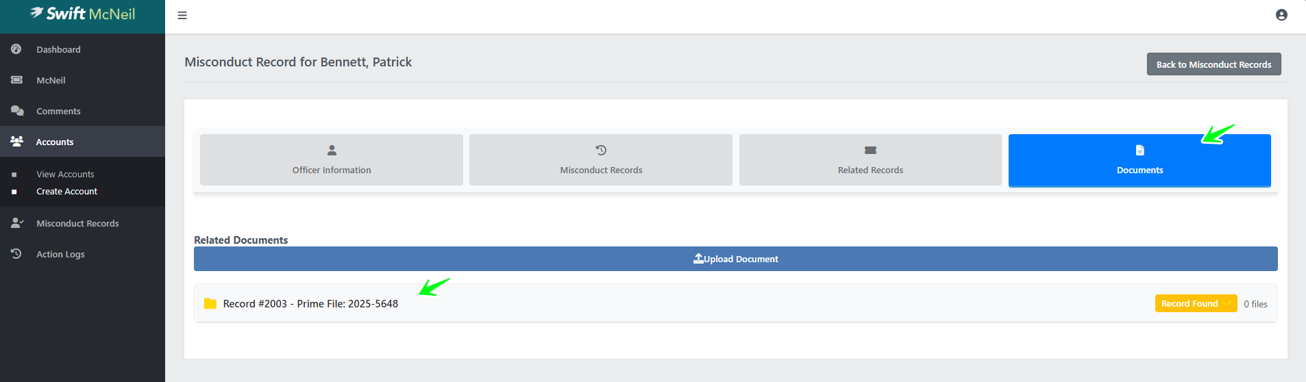 In the Misconduct Records section, click Documents and click the McNeil record to be reviewed. The status will be "Record Found" meaning an SROD was found for an Officer that is associated with this police file. This status is automated and will trigger upon the initial data entry done by Court Liaison Staff.