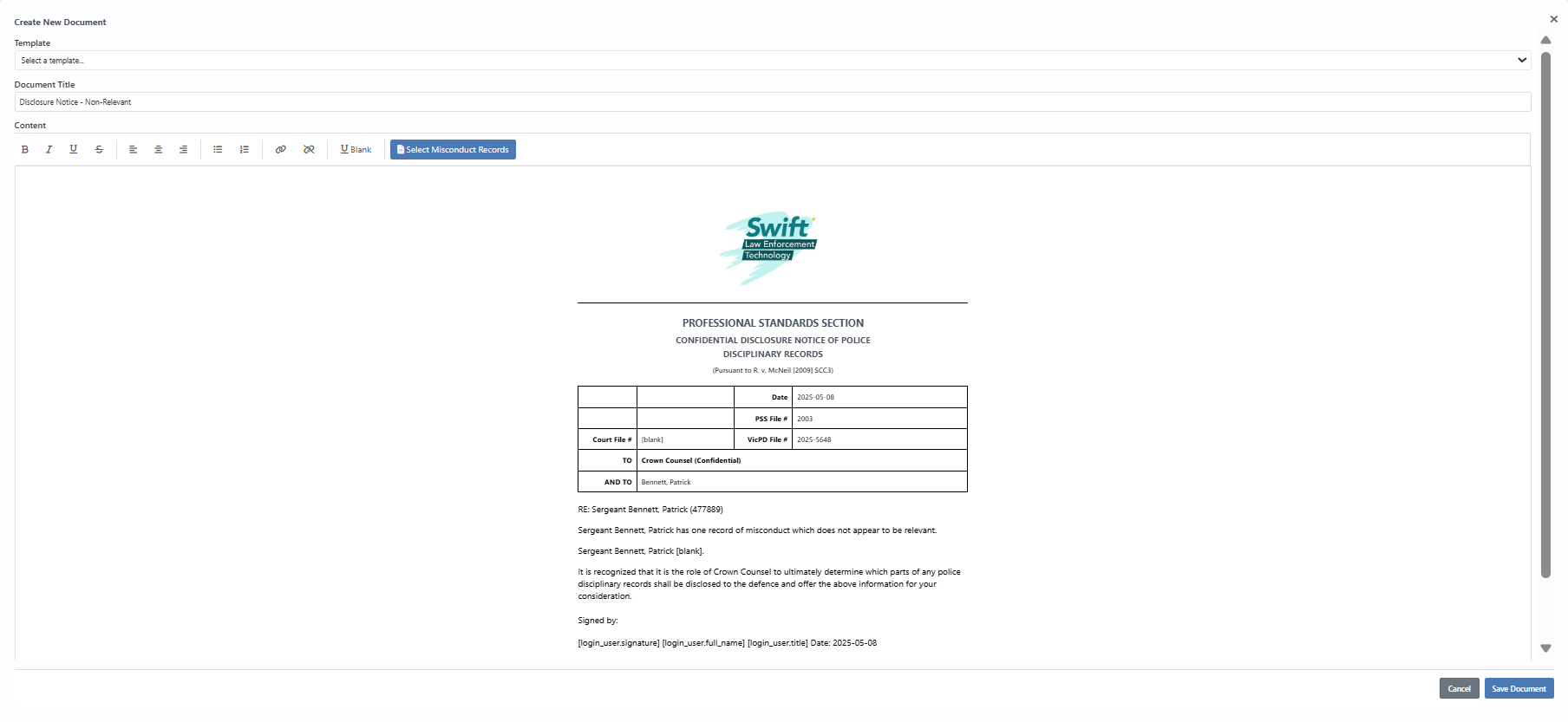 To complete the review process click the Misconduct Status button, based on the Section of Relevant or Non-Relevant the Document screen will open with the appropriate disclosure letter template pre-filled.